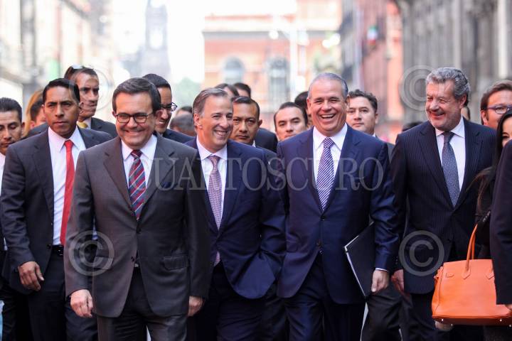 CIUDAD DE MÉXICO, 18OCTUBRE2017.- Ildefonso Guajardo, secretario de Economía; José Antonio Meade Kuribreña, secretario de Hacienda y Crédito Público, Rogelio Cerda Pérez, titular de la Procuraduría Federal del Consumidor (PROFECO), y Héctor Grisi Checa, presidente ejecutivo de Grupo Santander México, a su llegada a la conferencia de prensa para anunciar la edición 2017 del Buen Fin, programa de descuentos en toda la República. FOTO: GALO CAÑAS /CUARTOSCURO.COM