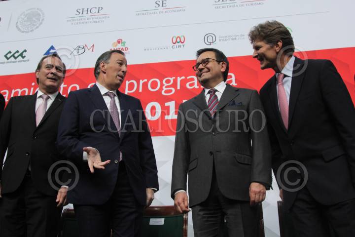 CIUDAD DE MÉXICO, 18OCTUBRE2017.- Juan Pablo Castañón Castañón, presidente del Consejo Coordinador Empresarial; José Antonio Meade Kuribreña, secretario de Hacienda y Crédito Público; Ildefonso Guajardo, secretario de Economía, y Enrique de la Madrid Cordero, secretario de Economía, durante la conferencia de prensa para anunciar la edición 2017 del Buen Fin, programa de descuentos en toda la República. FOTO: GALO CAÑAS /CUARTOSCURO.COM