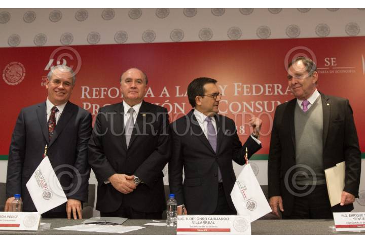 CIUDAD DE MÉXICO, 08FEBRERO2018.- Rogelio Cerda Pérez, Procurador Federal del Consumidor; el diputado federal Jorge Dávila Flores; Ildefonso Guajardo, secretario de Economía, y Enrique Solana Sentíes, presidente de la Concanaco-Servytur, durante el acto para conmemorar el 42 aniversario de la Profeco. FOTO: MOISÉS PABLO /CUARTOSCURO.COM