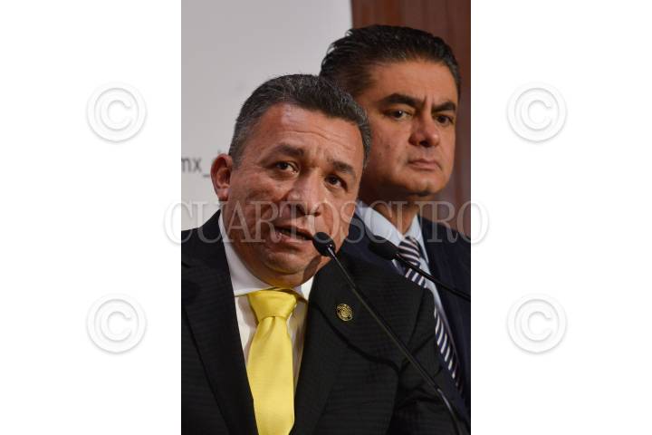 Jesús Velázquez, diputado suplente de Rogelio Franco, por parte del PRD, y Luis Espinosa Cházaro, coordinador del PRD, durante conferencia de prensa, mientras se lleva a cabo la sesión ordinaria de la Cámara de Diputados.