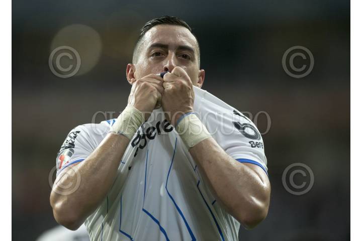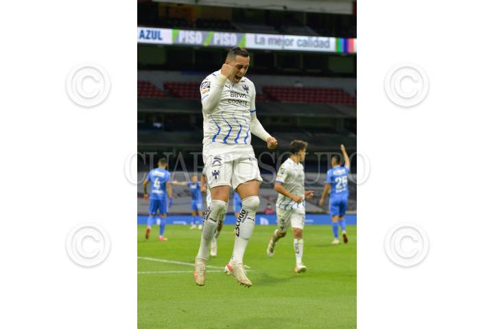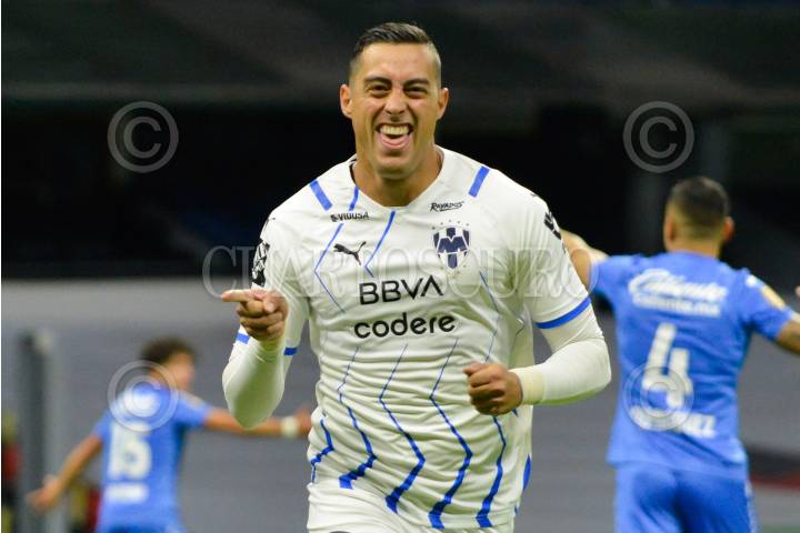 Rogelio Funes Mori, delantero del Monterrey, celebra su segunda anotación para poner en ventaja a su equipo de 3 a 1 frente al Cruz Azul, en partido repechaje de la Liga MX Apertura 2021.