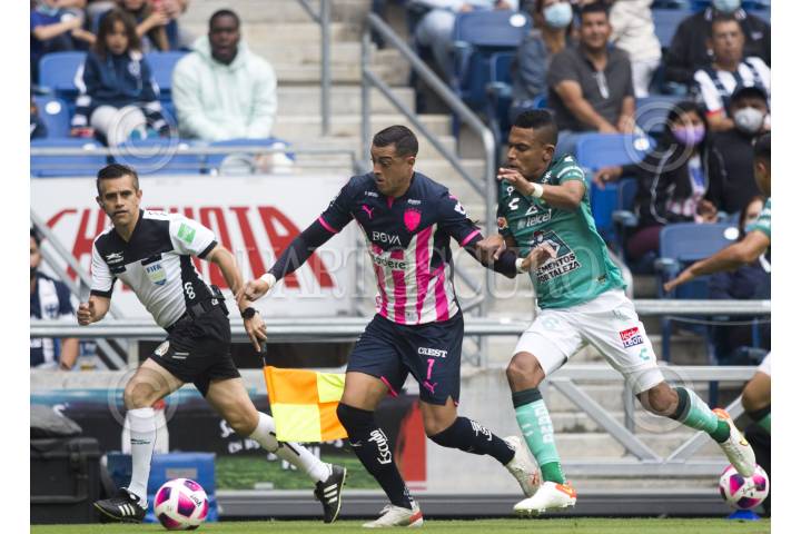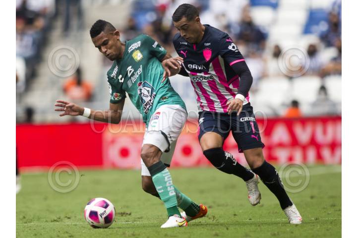 Rogelio Funes Mori del equipo de los Rayados del Monterrey, se disputa el balón con William Tresillo del León, en el estadio BBVA Bancomer, partido correspondiente a la jornada 13, de la Liga Mx, Apertura 2021. Marcador Final: Monterrey: 0 - León: 1