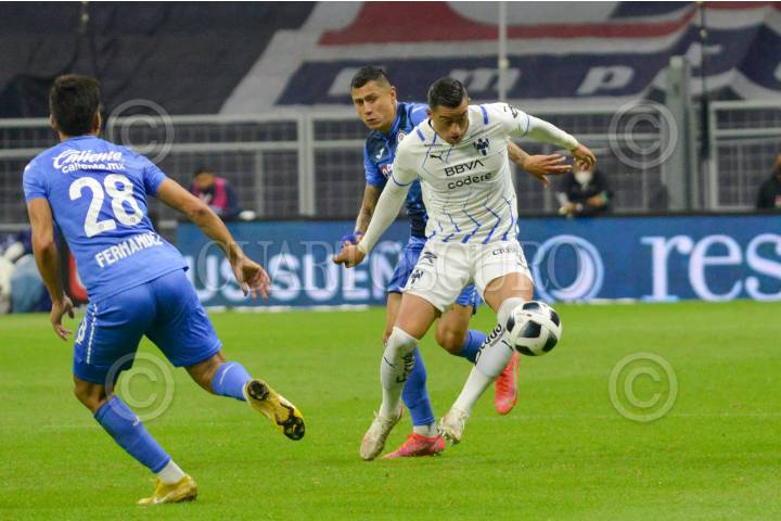 Rogelio Funes Mori de los Rayados del Monterrey se disputa el balón con Juan Escobar de Cruz Azul, en el estadio BBVA, partido correspondiente a la jornada 6 de la Clausura 2023.
