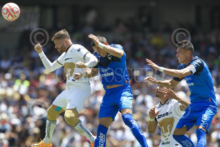 Arturo Ortiz de Pumas y Rogelio Funes Mori de Monterrey durante el partido de fútbol Pumas vs Monterrey correspondiente a la jornada 6 del Torneo Apertura 2022 de Liga BBVA MX, en el estadio Olímpico Universitario.