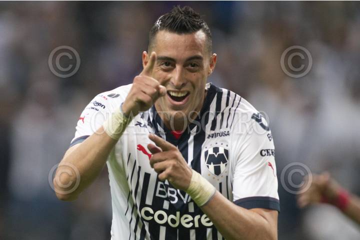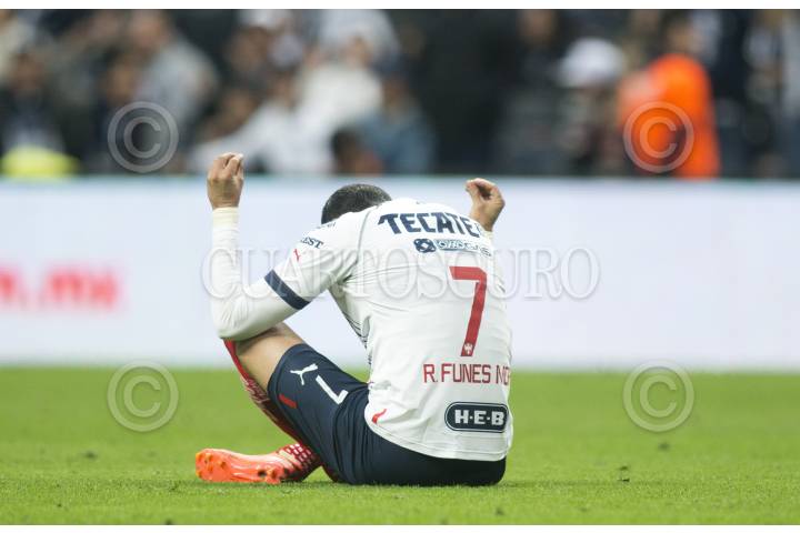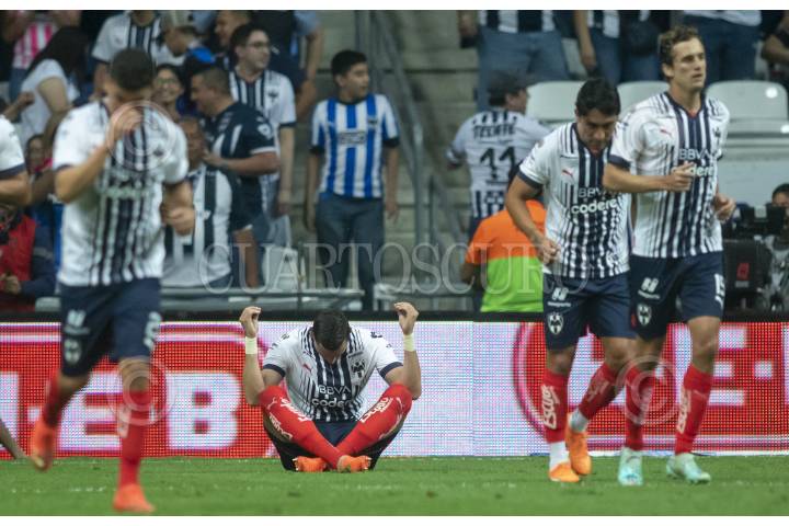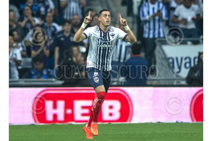 Rogelio Funes Mori de los Rayados del Monterrey, festeja el gol ante Santos, en el estadio BBVA, partido correspondiente a la vuelta en cuartos de final de la Clausura 2023.
