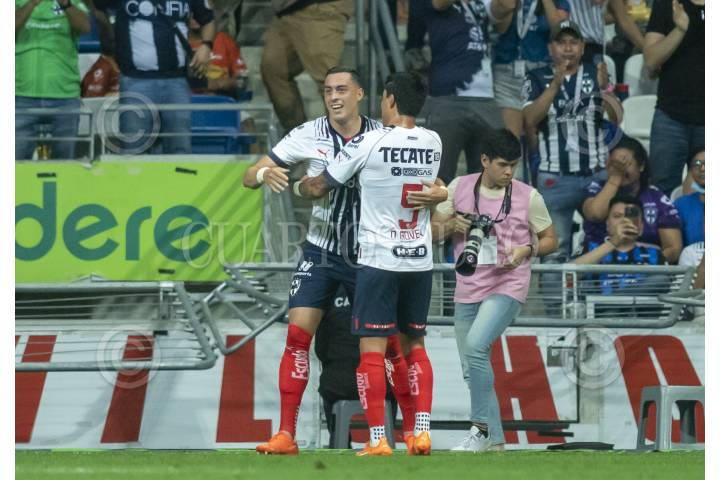 Rogelio Funes Mori y Omar Govea de Rayados festejan el gol ante Pumas, en el estadio BBVA, partido correspondiente a la jornada 17 de la Clausura 2023.