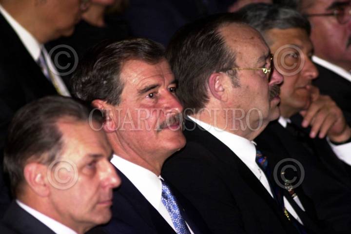 Jacques Rogge, Vicente Fox, Mario Vázquez Raña y Andrés Manuél López Obrador, presidentes del Comité Olímpico Internacional, de México, del Comité Organizador y Jefe de Gobierno de la capital respectivamente, antes de iniciar la ceremonia de inaguración de la 114 Asamblea del Comité Olímpico Internacional, en el Palacio de las Bellas Artes. FOTO: Juan Pablo Zamora/CUARTOSCURO.COM