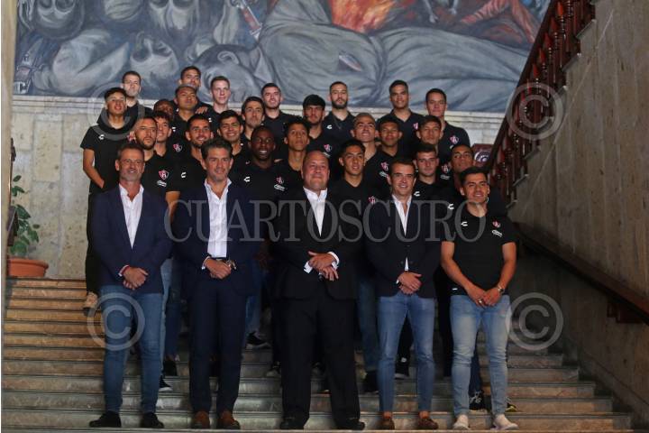 El equipo, cuerpo técnico y directivos del Club Atlas, durante la fotografía oficial con el Gobernador Enrique Alfaro Ramírez, en Palacio de Gobierno.