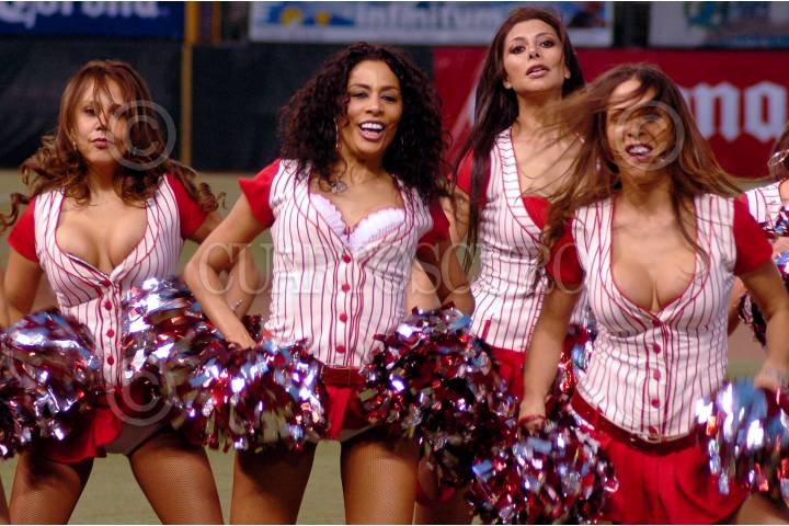 MÉXICO D.F., 17MARZO2010.- Las porristas de los Diablos rojos del México durante el encuentro en contra de los Sultanes de Monterrey en este día que inciaron las actividades de la Liga Mexicana de Beisbol en el Foro Sol y del 70 aniversario de los Diablos Rojos. FOTO: RODOLFO ANGULO/CUARTOSCURO.COM