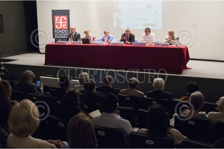 MÉXICO, D.F., 19AGOSTO2015.- Fabricio Mejía, Alejandro Brito, Elena Poniatowska y Marta Lamas, durante el Homenaje a Carlos Monsiváis en la sal Miguel Covarrubias del Centro Cultural Universitario de la UNAM a cinco años de su fallecimiento. FOTO: ADOLFO VLADIMIR /CUARTOSCURO.COM
