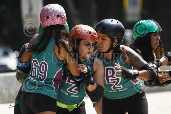 vMÉXICO, D.F., 07MARZO2015.- Chicas de entre 20 a 30 años de la liga Roller Derby se enfrentan en un partido en un parque de Polanco. Roller Derby es un deporte de contacto, originario de Estados Unidos, basado en el patinaje sobre ruedas y normalmente practicado por mujeres. Mañana domingo se celebra el Día Internacional de la Mujer, de acuerdo a cifras oficiales el 25 por ciento de los 28 millones de hogares están dirigidos por mujeres, es decir 6.9 millones de familias reconocen a una mujer como jefa; el 84% de los hogares monoparentales son encabezados por mujeres y 16% por hombres. FOTO: RODOLFO ANGULO /CUARTOSCURO.COM