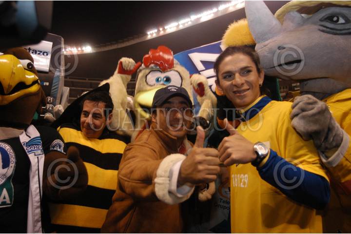 MÉXICO D.F. 08NOVIEMBRE2006.- En la cancha del estadio Azteca se realizo la sexta carrera de botargas organizada por el programa ¨Otro Rollo¨. Las mascotas de diversos equipos, universidades y empresas participaron en esta competencia comico-deportiva. Los conductores Jordi Rosado y Adal Ramones con la corredora Ana Gabriela Guevara. FOTO: GERMÁN ROMERO/CUARTOSCURO.COM