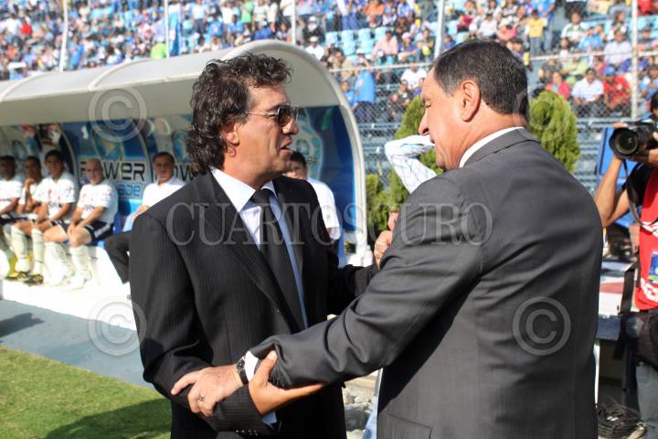 MÉXICO, D.F., 16OCTUBRE2010.- Los directores Ruben Román Romano, Santos y Enrique "Ojitos" Meza, Cruz Azul, se saludan antes de iniciar el juego entre sus equipos en el Estadio Azul. Los azules se afianzaron en el superliderato con tres tantos; Alejandro Vela 6´, Horacio Cervantes 47´ y Christian "Chaco" Giménez. FOTO: MOISÉS PABLO/CUARTOSCURO.COM
