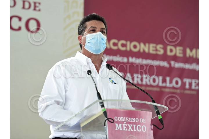 Mario Alberto López Hernández; Francisco García Cabeza de Vaca; Román Meyer Falcón; Andrés Manuel López Obrador, y Jesús Ramírez Cuevas, durante el evento de Accioones de Mejoramiento Urbano en Matamoros, Tamaulipas