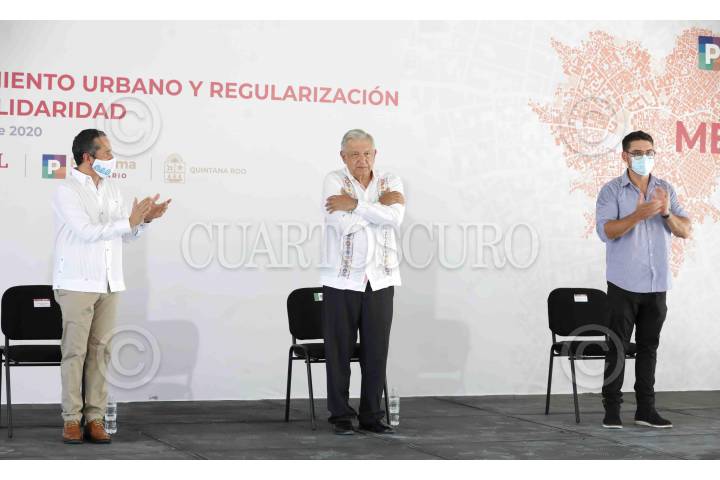 Carlos Joaquín González, Andrés Manuel López Obrador, y Román Meyer Falcón, durante el evento "Acciones de mejoramiento urbano y regularización en el municipio de Solidaridad en Ciudad Juventud".