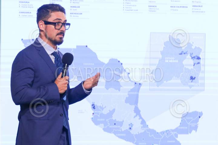 Román Meyer Falcón, secretario de Desarrollo Agrario Territorial y Urbano, explica parte de los proyectos durante la presentación del Programa de Mejoramiento Urbano en Sonora.