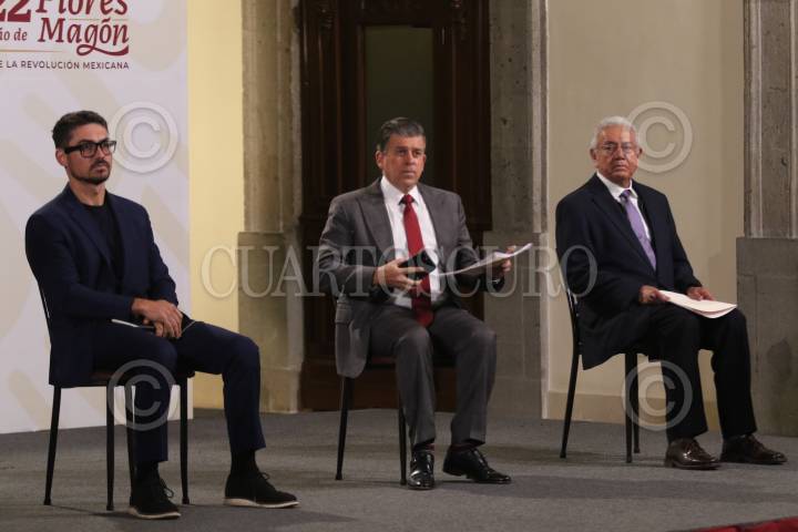 Román Meyer Falcón, titular de la Sedatu; Ricardo Sheffield Padilla, titular de Profeco, y Luis Hernández Palacios, Procurador Agrario, durante la mañanera en Palacio Nacional.