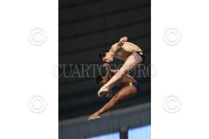 MÉXICO, D.F., 21JUNIO2008.- El clavadista olímpico Romel Pacheco y Omar Ojada en un clavado sincronizado durante una exhibición que se realizo en la Alberca Olímpica. FOTO: RODOLFO ANGULO/CUARTOSCURO.COM