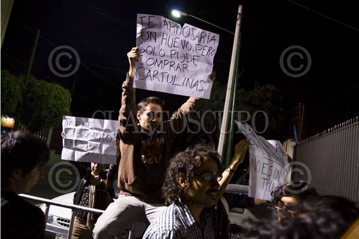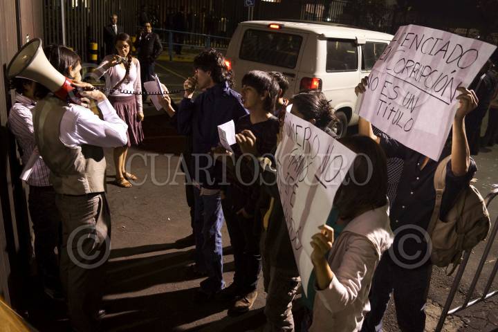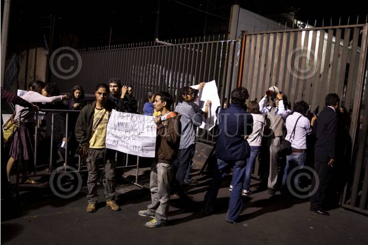 MÉXICO, D.F., 04OCTUBRE2012.- Jóvenes del movimiento #Yo soy 132 agrupados en la Asamblea Popular Benito Juárez, se manifestaron a las afueras del Gimnasio Olímpico, en donde el panista Jorge Romero, tomó protesta como nuevo Jefe Delegacional de la Benito Juárez. Denunciaron las irregularidades en las pasada elección, además de la corrupción en que se ha dado en el gobierno delegacional. FOTO: ADOLFO VLADIMIR /CUARTOSCURO.COM