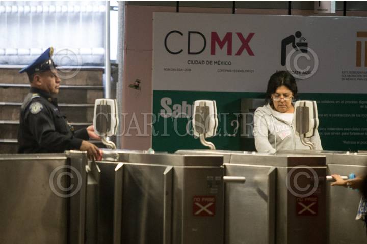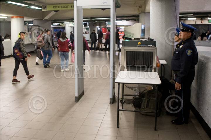 CIUDAD DE MÉXICO, 24DICIEMBRE2017.- Aspectos de la seguridad en la Linea B del Metro de la capital, donde hace unos días como resultado de un asalto en la estación Romero Rubio un hombre recibió un balazo en la cabeza. Apesar de que las estaciones cuentan con detectores de metal y maquinas para revisar mochilas, los oficiales no pueden obligar a las personas a que pasen por el detector de armas. FOTO: TERCERO DÍAZ /CUARTOSCURO.COM