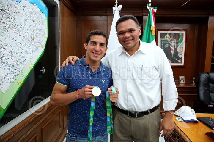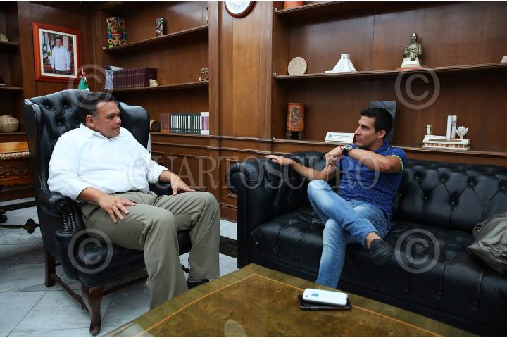 MÉRIDA, YUCATÁN, 27FEBRERO2016.- Rommel Pacheco medallista de oro en la prueba de trampolín de tres metros durante la Copa Mundial de Clavados celebrada recientemente en Río de Janeiro, Brasil se reunió esta mañana con el Gobernador Rolando Zapata Bello para compartir diversas anécdotas de la competencia que tuvo lugar en el país sudamericano que próximamente será sede de los Juegos Olímpicos. FOTO: FRANCISCO BALDERAS /CUARTOSCURO.COM