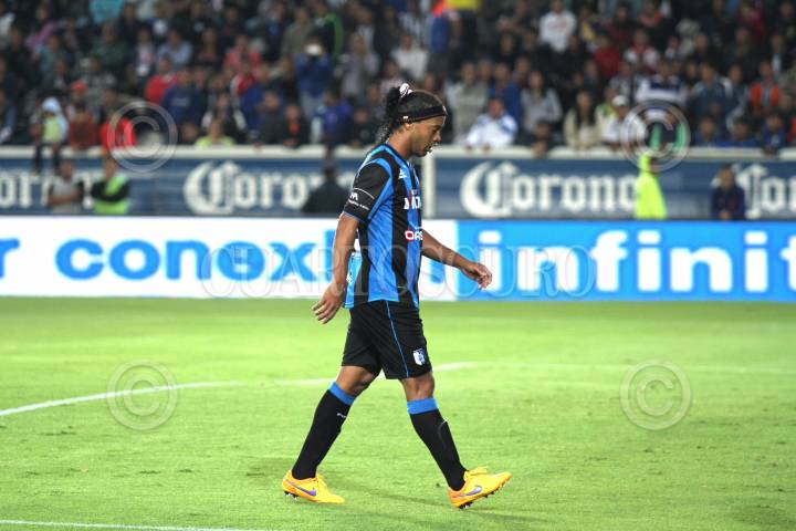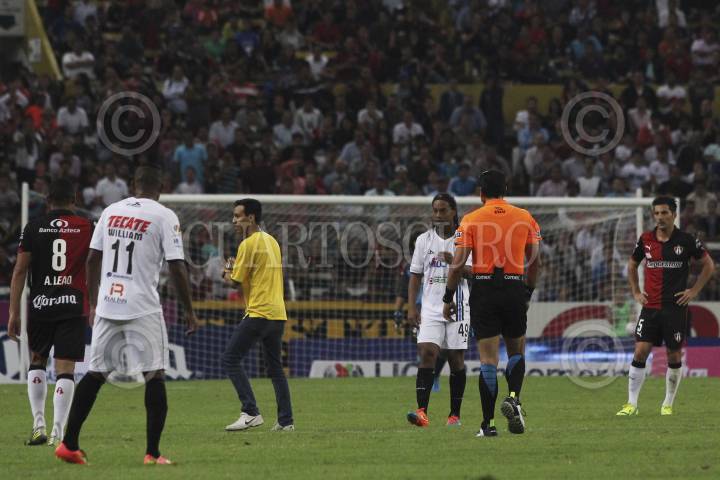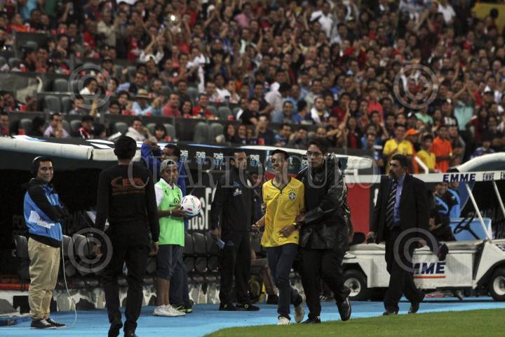 GUADALAJARA, JALISCO, 30SEPTIEMBRE2014.- Esta noche en el Estadio Jalisco de y en partido correspondiente a la Jornada 11 del Torneo Apertura 2014 de la Liga MX, se enfrentan los equipos de los Zorros del Atlas frente a Gallos Blancos de Querétaro. En la imagen un aficionado de Ronaldinho se mete a la cancha para pedir un autógrafo del jugador. FOTO: FERNANDO CARRANZA GARCIA /CUARTOSCURO.COM