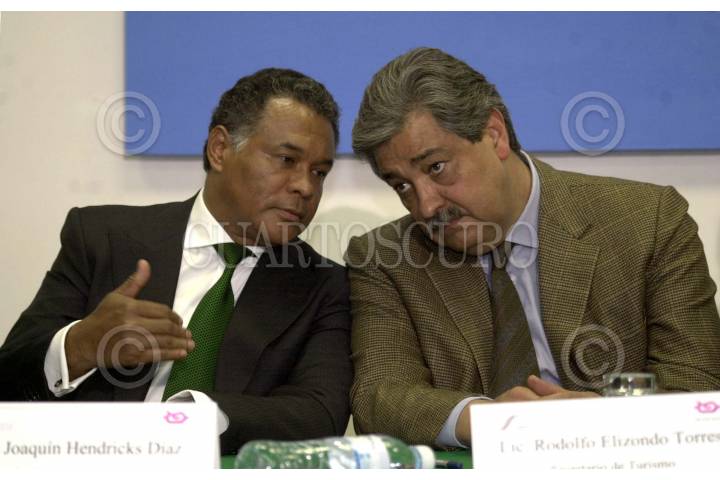 México, D.F. FEBRERO 2004.-Joaquin Henricks Díaz, gobernador de Quintana Roo y Rodolfo Elizondo, secretario de Turismo, durante la conferencia de prensa donde se anunció el programa de relanzamiento del Mundo Maya. FOTO: Sandra Perdomo/CUARTOSCURO.COM