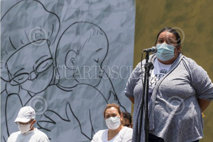 Rosa Areli Hernández, madre de Jonathan García Hernández, quien padeció el desabasto de medicamentos para tratar la leucemia que padece su hijo, durante su intervención en el mitin de la marcha denominada #QuímiosSí.