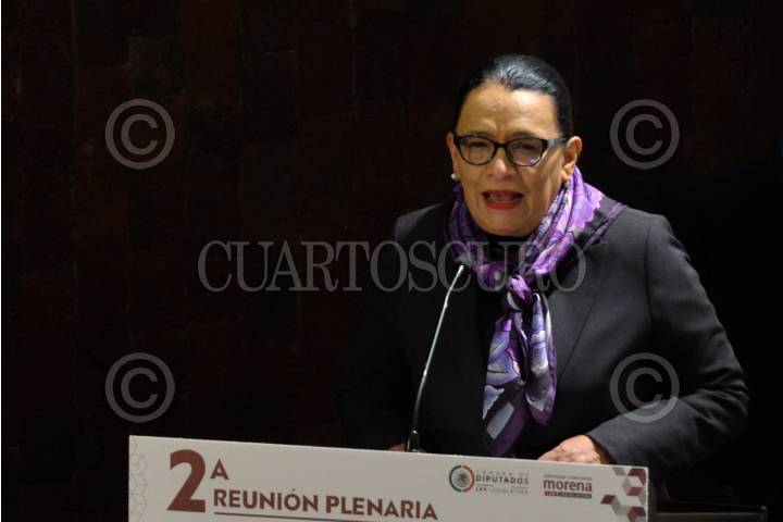 Rosa Icela Rodríguez, secretaria de Seguridad y Protección Ciudadana, durante su participación en la Quinta Reunión Plenaria del grupo parlamentario de Morena correspondiente al último año se ejercicio constitucional de la LXV Legislatura de la Cámara de Diputados.