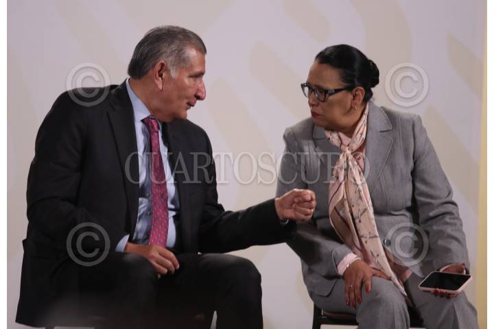 Adán Augusto López Hernández, secretario de Gobernación y Rosa Icela Rodríguez Velázquez, secretaria de Seguridad y Protección Ciudadana durante conferencia de prensa en Palacio Nacional.