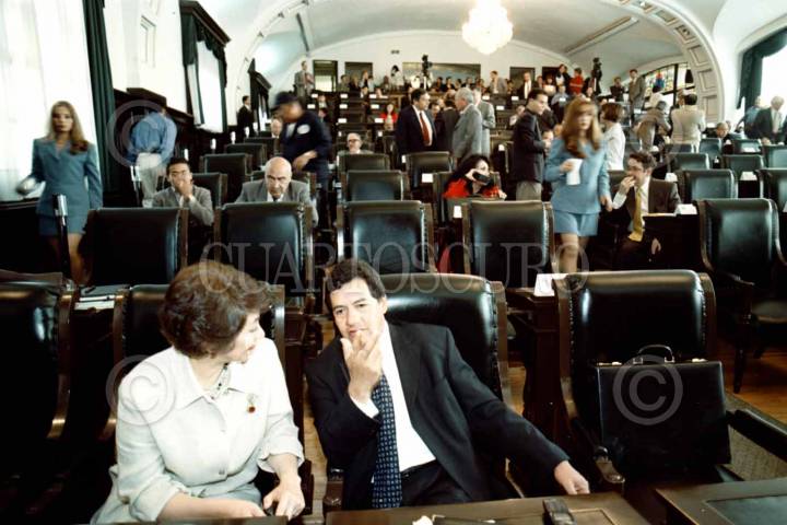 Los senadores perredistas Rosalbina Garavito e Higinio Martinez, momentos antes de iniciar la sesion en la Camara Alta.
