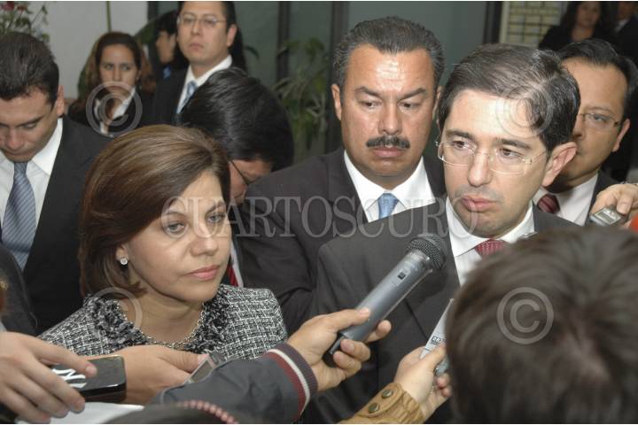 MÉXICO, D.F., 10JULIO2012.- Secretaria del Trabajo y Previsión Social, Rosalinda Vélez Juárez, y el Secretario de Comunicaciones y Transportes, Dionisio Pérez-Jácome Friscione, ofrecieron una rueda de prensa al término de la reunión que sostuvieron con el representante de los inversionistas del Grupo Med Atlántica, Christian Cadenas, para dialogar en torno a la situación actual de la Compañía Mexicana de Aviación. FOTO: CUARTOSCURO.COM