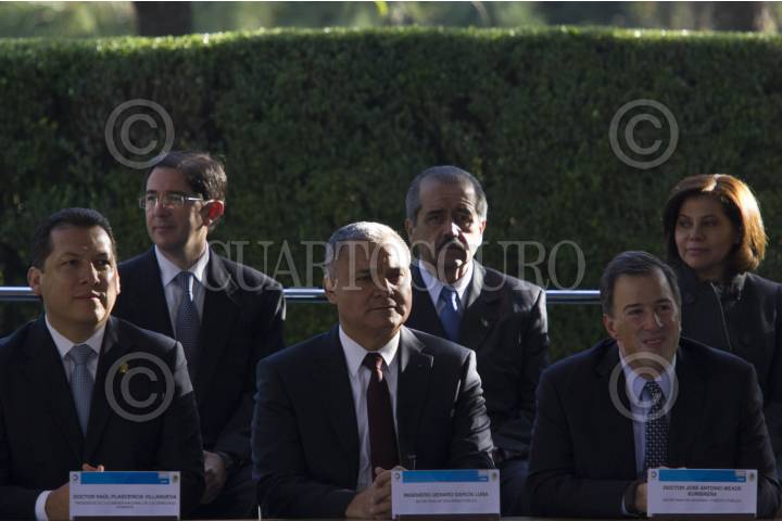 MÉXICO, D.F., 20NOVIEMBRE2012.- Raúl Plascencia Villanueva, presidente de la Comisión Nacional de Derechos Humanos, Dionisio Pérez-Jácome, secretario de Comunicaciones y Transportes, Genaro García Luna, secretario de Seguridad Pública federal, José Ángel Córdova Villalobos, secretario de Educación Pública, José Antonio Meade Kuribreña, secretario de Hacienda y Crédito Público, y Rosalinda Velez Juárez, secretario del Trabajo, en la explanada del monumento a Francisco I. Madero, en los Pinos, en donde se realizó la ceremonia conmemorativa del CII Aniversario del Inicio de la Revolución Mexicana. FOTO: MOISÉS PABLO /CUARTOSCURO.COM