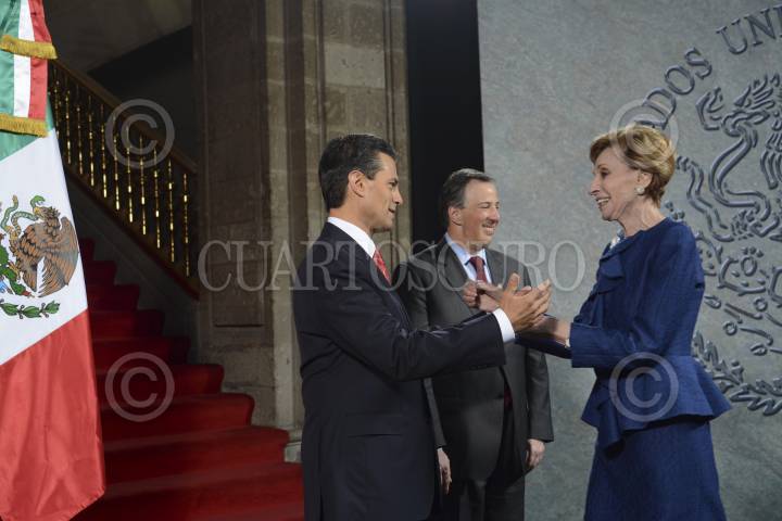 MÉXICO, D.F., 10ENERO2014.- El Presidente de la República, Enrique Peña Nieto, invitó a la diplomacia mexicana a transmitir al mundo que lo que México ha alcanzado no es menor, ya que se trata de un gran avance que debe proyectarse y compartirse con la comunidad internacional. En la imagen lo acompañan José Antonio Meade Kuribreña, secretario de Relaciones Exteriores y Rosario Green, embajadora emérita. FOTO: PRESIDENCIA /CUARTOSCURO.COM