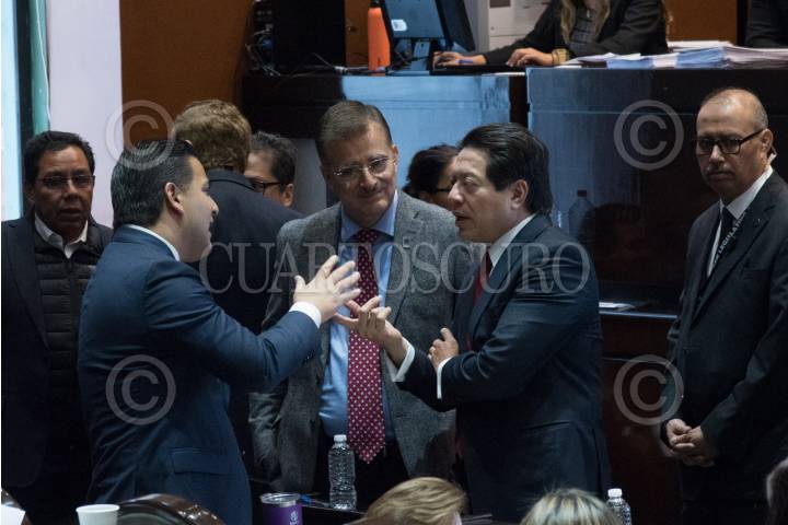Damián Zepeda, senador del PAN, junto a los diputados coordinadores: Itzcóatl Tonatiuh Bravo (MC) y Mario Delgado (Morena), durante la comparecencia de Rosario Piedra, titular de la Comisión Nacional de Derechos Humanos (CNDH).