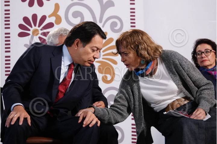 CIUDAD DE MÉXICO, 23OCTUBRE2024.- Mario Delgado, secretario de Educación Pública, y Rosaura Ruíz Gutiérrez, secretaria de Ciencia Humanidades, Tecnología e Innovación, conversaron durante la conferencia "La Mañanera del Pueblo", realizada en el Salón de Tesorería en Palacio Nacional. FOTO: GRACIELA LÓPEZ/CUARTOSCURO.COM