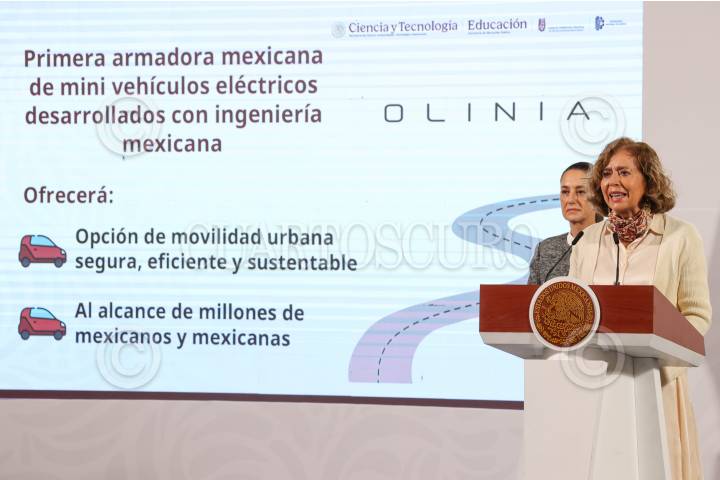 CIUDAD DE MÉXICO, 06ENERO2025.- Rosaura Ruiz Gutiérrez, secretaria de Ciencia, Humanidades, tecnología e Innovación; explica las características de los automóviles eléctricos que el gobierno federal pretende construir y que ha denominado Olinia, durante la mañanera del pueblo en Palacio Nacional. FOTO: MOISÉS PABLO/CUARTOSCURO.COM