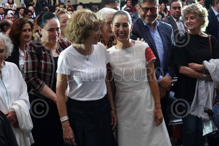 Claudia Sheinbaum, Enrique Graue, Rocío Barcena, y Rosaura Ruiz Gutiérrez, durante la ceremonia de cancelación de la Estampilla Postal de 100 años del Escudo y Lema Universitario.