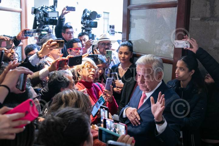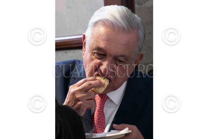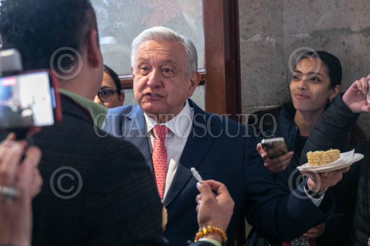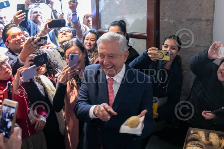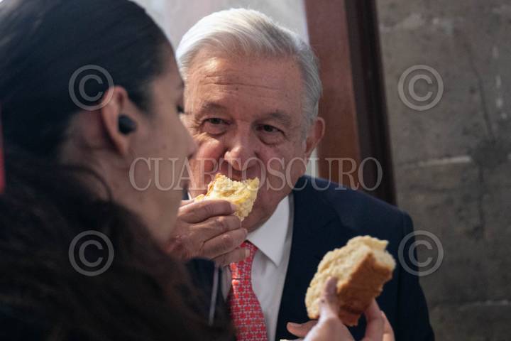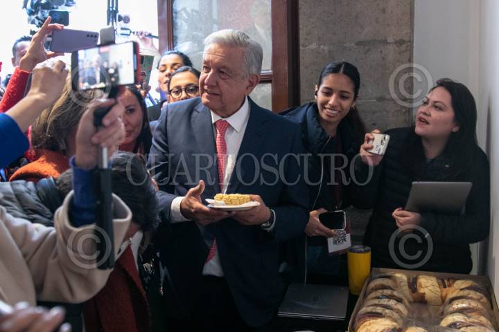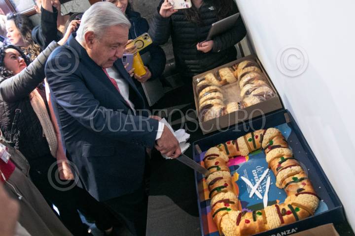 CIUDAD DE MÉXICO, 08ENERO2024.- Andrés Manuel López Obrador, Presidente de México, partió la rosca con reporteros en la sala de prensa junto a reporteros que cubren la mañanera, el mandatario mostró su rebanada para demostrar que no le tocó el muñeco y comprometió a los periodistas que si se lo sacaron a traer los tamales el Día de la Candelaria. FOTO: MOISÉS PABLO/CUARTOSCURO.COM