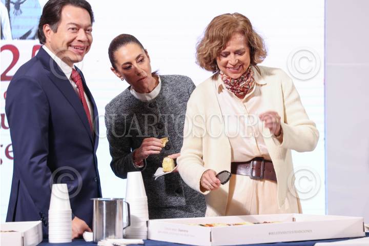 CIUDAD DE MÉXICO, 06ENERO2025.- Claudia Sheinbaum, Presidenta de México, partió la rosca de reyes al finalizar la mañanera del pueblo. La acompañaron funcionarios como Rosaura Ruiz Gutiérrez, Mario Delgado y Diego Prieto. FOTO: MOISÉS PABLO/CUARTOSCURO.COM