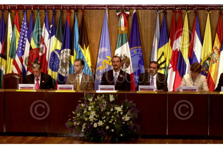 MEXICO, D.F. 21ABRIL2005.- Luis Ernesto Derbez, Secretario de Relaciones Exteriores, Vicente Fox Quesada, presidente de México, Javier Usabiaga, Secretario de Agricultura, Ganadería, Desarrollo Rural, Pesca y Aimentación (SAGARPA) y Mirta Roses Periago, directora de la organización Panamericana de la Salud en la ceremonia de inauguración de la XIV reunión interamericana a nivel ministerial en Salud y Agricultura. FOTO:/CUARTOSCURO.COM