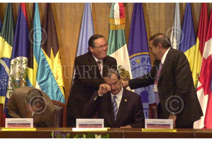 MEXICO, D.F. 21ABRIL2005.- Luis Ernesto Derbez, Secretario de Relaciones Exteriores, Vicente Fox Quesada, presidente de México, Jaime Alfonso Campos Quiroga, ministro de Agricultura de la República de Chile y Javier Usabiaga, Secretario de Agricultura, Ganadería, Desarrollo Rural, Pesca y Aimentación (SAGARPA) en la ceremonia de inauguración de la XIV reunión interamericana a nivel ministerial en Salud y Agricultura. FOTO: /CUARTOSCURO.COM