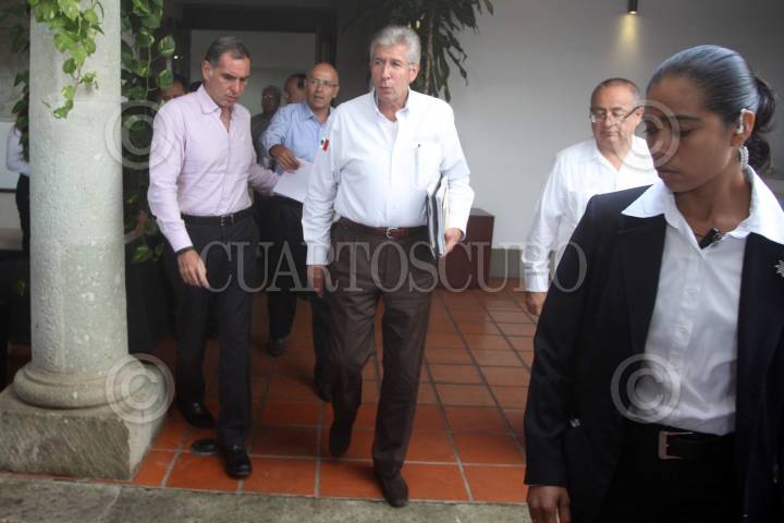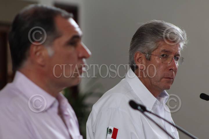 OAXACA, OAXACA, 23SEPTIEMBRE2013.- El titular de la SCT, Gerardo Ruiz Esparza acudió este lunes a la ciudad de Oaxaca para sostener una reunión con el gobernador, Gabino Cué, tras lo cual ofrecieron una conferencia de prensa en la que se informó del daño a la red carretera estatal, misma que tiene 20 puentes colapsados, 117 carreteras o caminos afectados lo que representa 3 mil 115 kilómetros dañados. FOTO: ARTURO PÉREZ ALFONSO /CUARTOSCURO.COM
