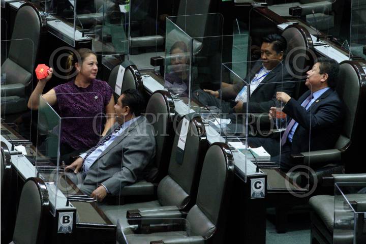 Nelly Maceda Carrera, diputada del PT, muestra su cubrebocas a Rubén Cayetano García, diputado de Morena, durante la sesión ordinaria de la Cámara de Diputados