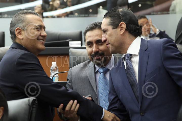MÉXICO, D.F., 17FEBRERO2015.- Manlio Fanio Beltrones, coordinador de los diputados del PRI, conversa con los panistas Rubén Camarillo Ortega y Juan Bueno Torio, en la sesión de la Cámara de Seenadores. FOTO: CUARTOSCURO.COM