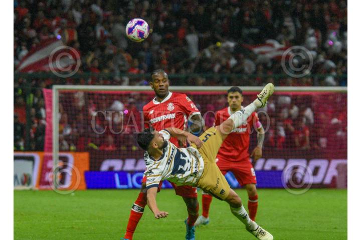 TOLUCA, ESTADO DE MÉXICO, 16AGOSTO2025.- Juan Domínguez medio de los Diablos de Toluca se enfrenta a Rubén Duarte defensa de la escuadra universitaria Pumas en la cancha del estadio Nemesio Diez, en el partido correspondiente a la jornada 5 del Torneo Apertura 2025 de la Liga MX, con un marcador final 1-1. FOTO: CRISANTA ESPINOSA AGUILAR/CUARTOSCURO.COM