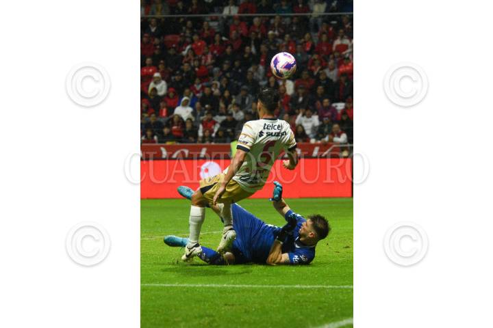 TOLUCA, ESTADO DE MÉXICO, 05OCTUBRE2024.- Tiago Voloi portero de los Diablos de Toluca y Rubén Duarte defensa de la escuadra universitaria de Pumas en el estadio Nemesio Diez, en el partido correspondiente a la jornada 11 del Torneo Apertura 2024, terminado el encuentro con un marcador 1-1. FOTO: CRISANTA ESPINOSA AGUILAR /CUARTOSCURO.COM