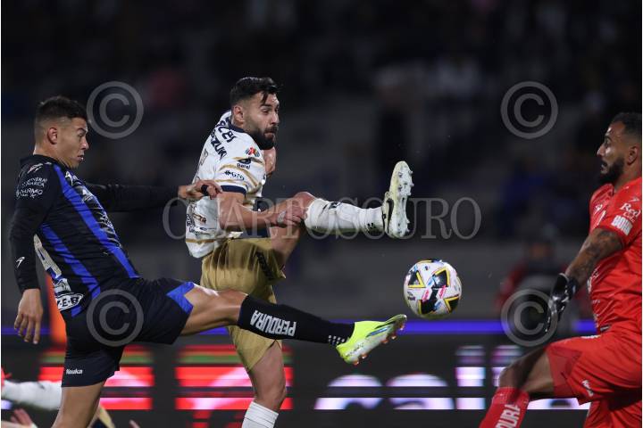 CIUDAD DE MÉXICO, 05NOVIEMBRE2024. Franco Russo y el portero Guillermo Allison de Gallos Blancos disputan una pelota al jugador Rubén Duarte de Pumas durante el partido de fútbol Pumas vs Querétaro correspondiente a la jornada 16 del Torneo Apertura 2024 de Liga BBVA MX, en el Estadio Olímpico Universitario. FOTO: EDGAR NEGRETE LIRA/CUARTOSCURO.COM