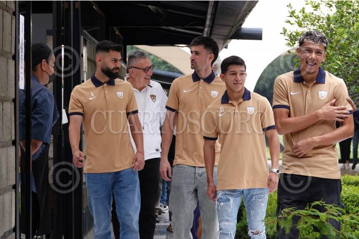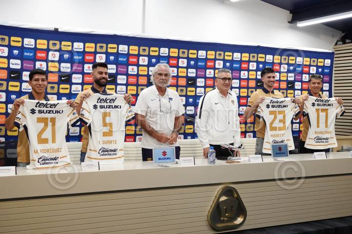 CIUDAD DE MÉXICO, 19JULIO2024.- Los refuerzos del Club Universidad Nacional Autónoma de México (UNAM): Michell Rodríguez (mediocampista), Rubén Duarte (defensa), Ignacio Pussetto (delantero) y Jorge Ruvalcaba (centrocampista) fueron presentados oficialmente ante el club para disputar las siguientes jornadas del torneo. Miguel Mejía Barón, vicepresidente deportivo, y Luis Raúl González, presidente del Club, fueron los encargados del anuncio. FOTO: GALO CAÑAS/CUARTOSCURO.COM