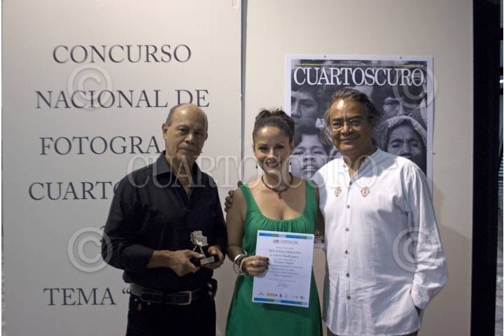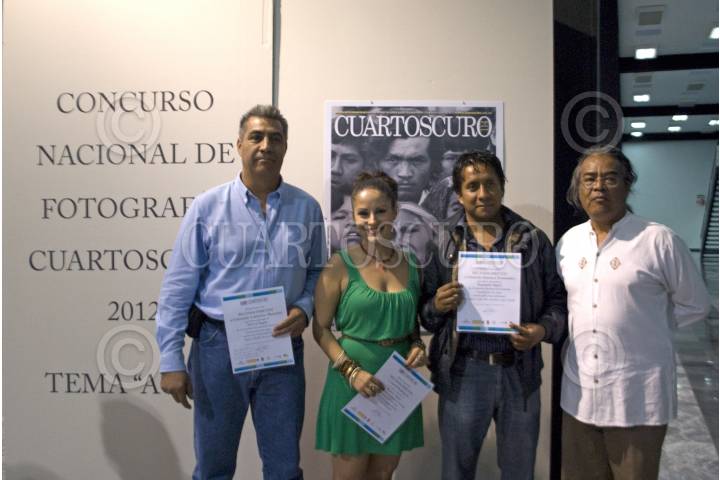 MÉXICO, D.F., 27JUNIO2012.- Los ganadores del concurso nacional de fotografía Cuartoscuro 2012 Edmundo Gutiérrez, Astrid Rodríguez y Eduardo Jiménez en compañía de Pedro Valtierra, director de la Revista Cuartoscuro, durante la inauguración de la exposición del concurso "El Agua" en el Instituto Politécnico Nacional. FOTO: JOYCE GARCÍA/ CUARTOSCURO.COM